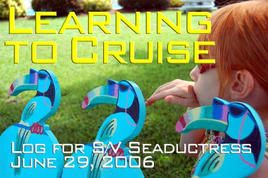 Thursday, July 29 - Hoboken Cut, ICW Mile 160 The good news was that by borrowing a scissors jack from a fellow named Kent who was hanging around the hardware store in Oriental, I was able to raise the engine and swap the port motor mount with relative ease. I disconnected the drive shaft at the coupling, took off the port cooling hose from the transmission, and was able to get the five inch high jack underneath the engine. I decided not to change the starboard rear mount today because it was going to be more difficult, and I wanted to see how the first mount worked first. The bad news is that the new mount--at least in tandem with the three older mounts--doesn't work very well. We get new and very "throaty" vibrations at idle (does Harley build sailboats now?) and we still have knocking at higher RPM's as well. In short, my hose-clamped older mount worked better, although I will admit the hose clamps were cutting into the rubber and would probably have destroyed the mount eventually. The other good news was that the new seals for the raw water pump finally arrived, which was appreciated since I'd already taken the pump apart. Good news: the Volvo Service Manual I have contained instructions for changing the seals. Bad news: the instructions were vague. Step 1: remove pump from engine. Step 2: disassemble pump. No details, but fortunately a drawing gave me enough clues. A snap ring (what I used to call a "circlip") was removed only with the help of Owen from the Southern Cross 35 Kokopelli, anchored nearby. Lucky for me folks around Oriental are helpful. I especially appreciated the nice folks at Inland Waterway Treasure Company for looking out for my packages and letting me use their bicycles for my many trips to the hardware and grocery store.